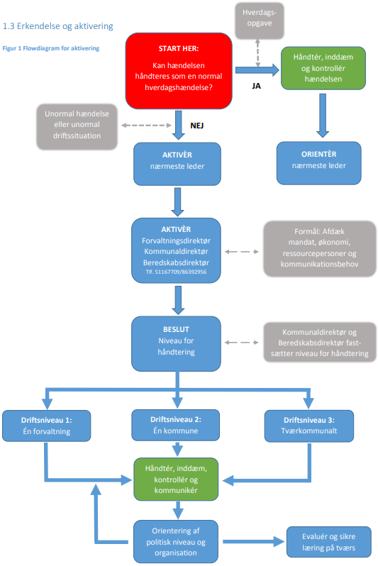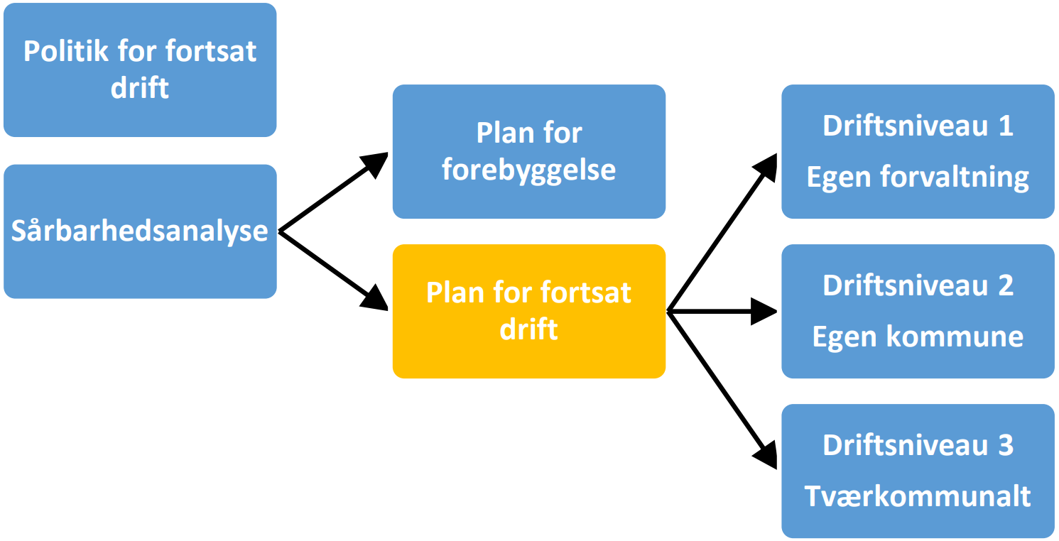 Nærværende Plan for fortsat drift, omfatter aktivering og drift af den kommunale krisestyringsorganisation, håndtering af information, koordinering af handlinger og ressourcer, krisekommunikation, operativ indsats samt genopretning og fortsat drift. Hændelser håndteres på tre driftsniveauer; enten i egen forvaltning, i egen kommune eller tværkommunalt. Mere om dette i kapitel 3.