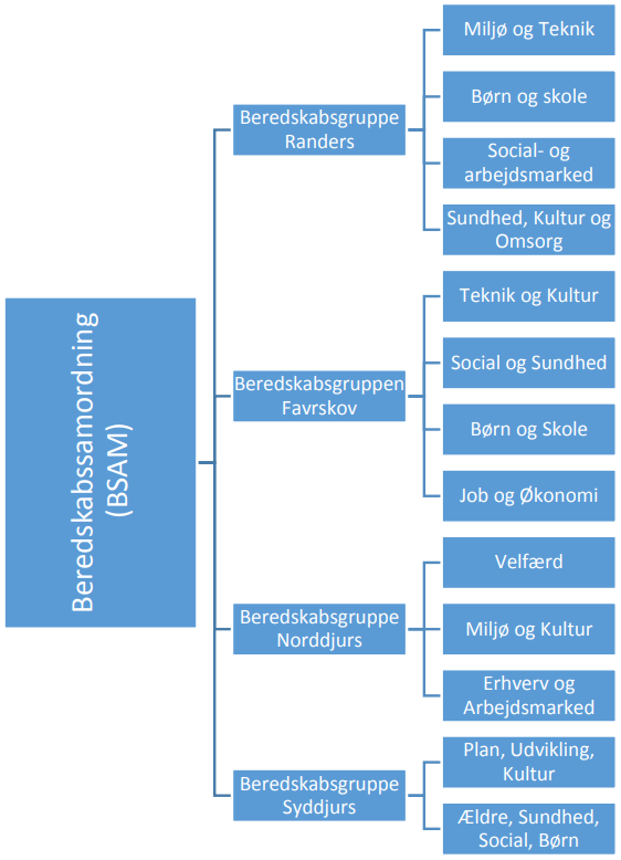 Den tværkommunale planlægning for fortsat drift forankres i Beredskabssamordningen (BSAM) for Randers, Favrskov, Norddjurs og Syddjurs Kommuner, se figur 3. Beredskabsdirektøren er formand for BSAM.