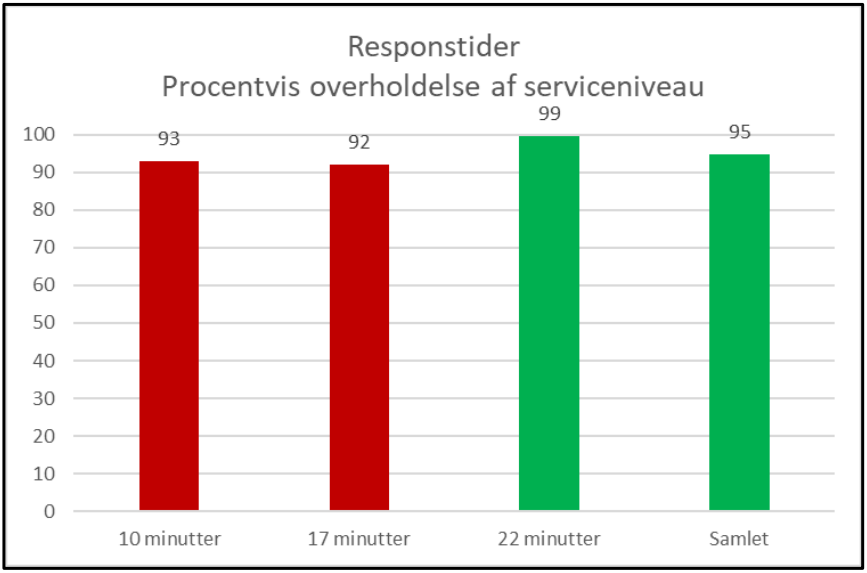 Responstiden fastsættes i de fire kommuner til 10-17-22 minutter i 95 % af tilfældene. Responstiden måles for først ankomne køretøj.